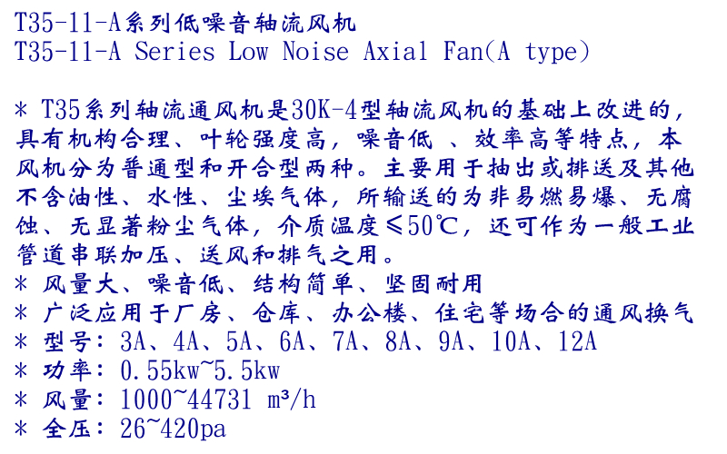 T35系列軸流通風(fēng)機(jī)是30K-4型軸流風(fēng)機(jī)的基礎(chǔ)上改進(jìn)的,具有機(jī)構(gòu)合理、葉輪強(qiáng)度高,噪音低 、效率高等特點,本風(fēng)機(jī)分為普通型和開合型兩種。